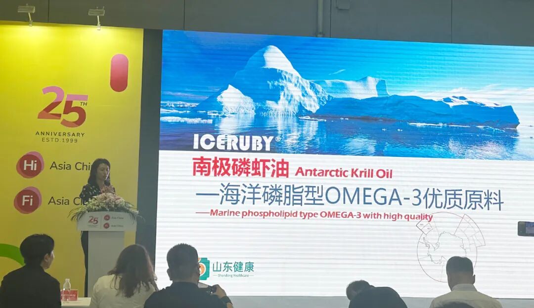 展会期间,山东健康集团海洋生物受邀参加潜入海洋宝库:欧米伽-3的趋势、挑战和发展战略论坛。作为特邀嘉宾出席的公司常务副总范宁宁就南极磷虾油作为海洋磷脂型欧米伽-3优质原料这一主题进行了分享,并与现场观众和展商进行了交流和合作意向的沟通。